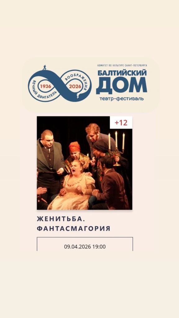 9 апреля в 19.00 на сцене театра-фестиваля «Балтийский дом» наши артисты представят спектакль «Женитьба. Фантасмагория» (режиссёр: заслуженный деятель искусств РФ Сергей Федотов) в рамках ХХVIII Фестиваля русских театров «Встречи в России».